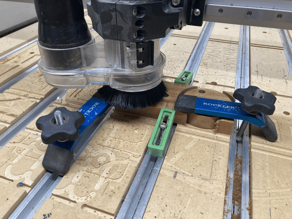 I started by machining the Koa on the CNC, with the hole patterns mirrored to bookmatch the grain on the wheels.