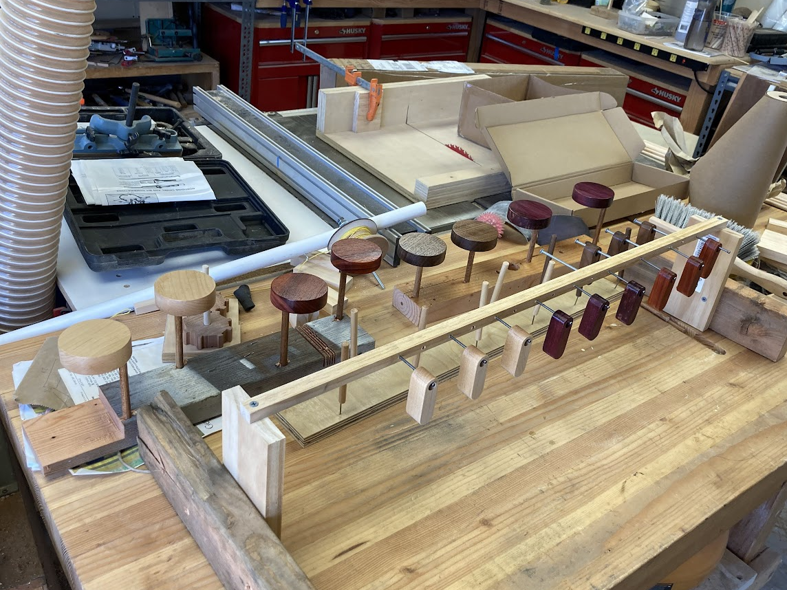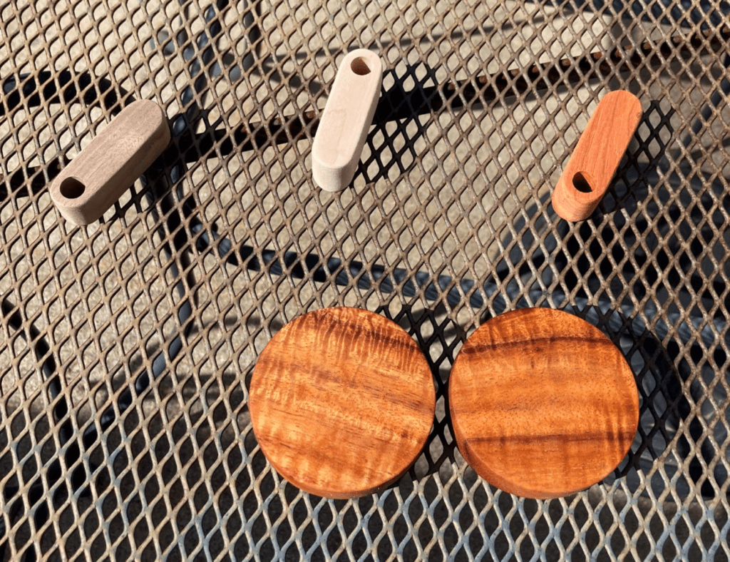 The clackers are made of some of my standard woods: walnut, maple, and padauk. Just look at that chatoyance on the Koa, that’s just sanded and wet, no finish: