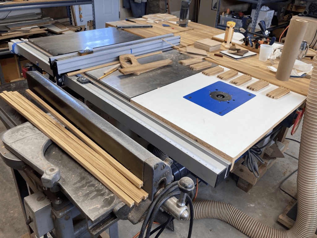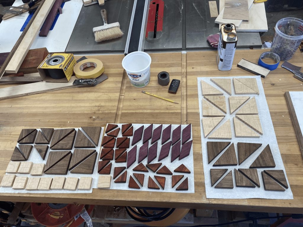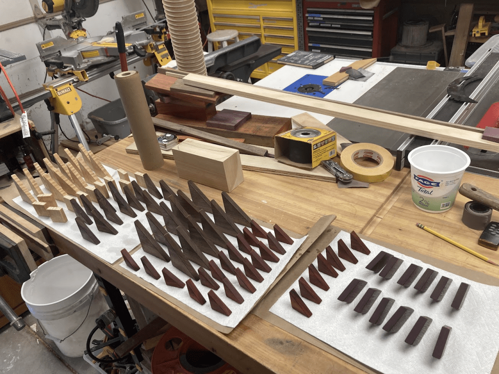 I used 1/2″ plywood to prototype and help develop a few jigs for my cross-cut sled, then started cutting out of hardwoods. As I started I decided if I was going to the trouble of making jigs and cutting one or two sets, I might as well cut a few more:
