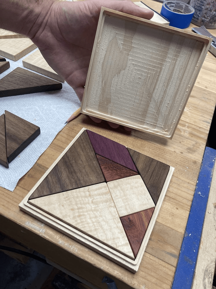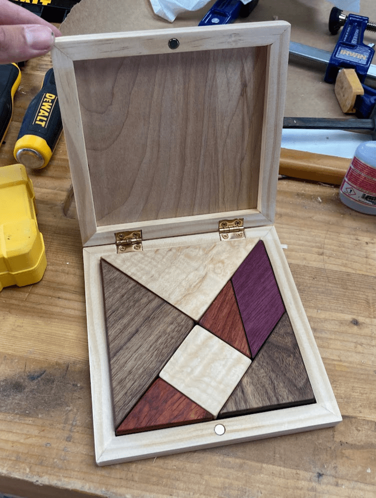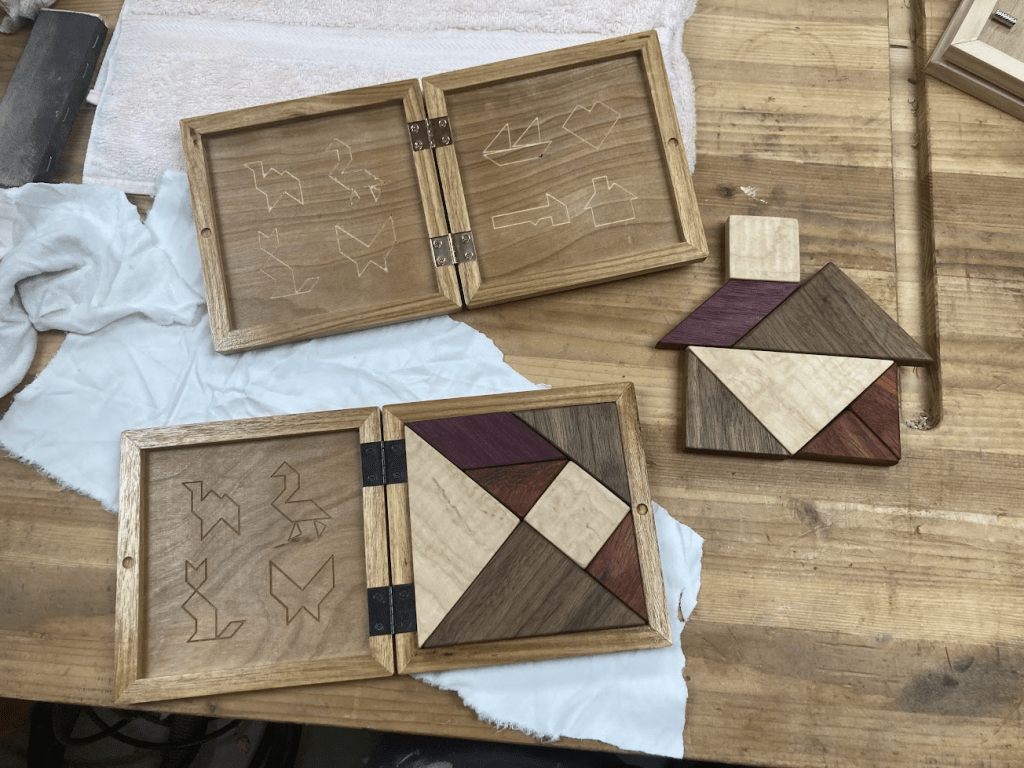 As a final touch, I engraved in a few tangram patterns inside the box, then finished in shellac. All in all I was able to make four boxes I was happy with. I gave two away and kept two, that I ended up listing on my Etsy shop, which sort of kicked this whole thing off.
