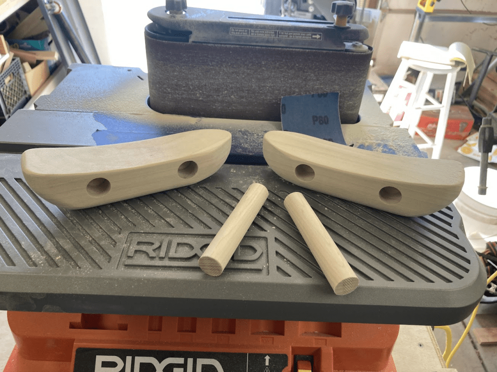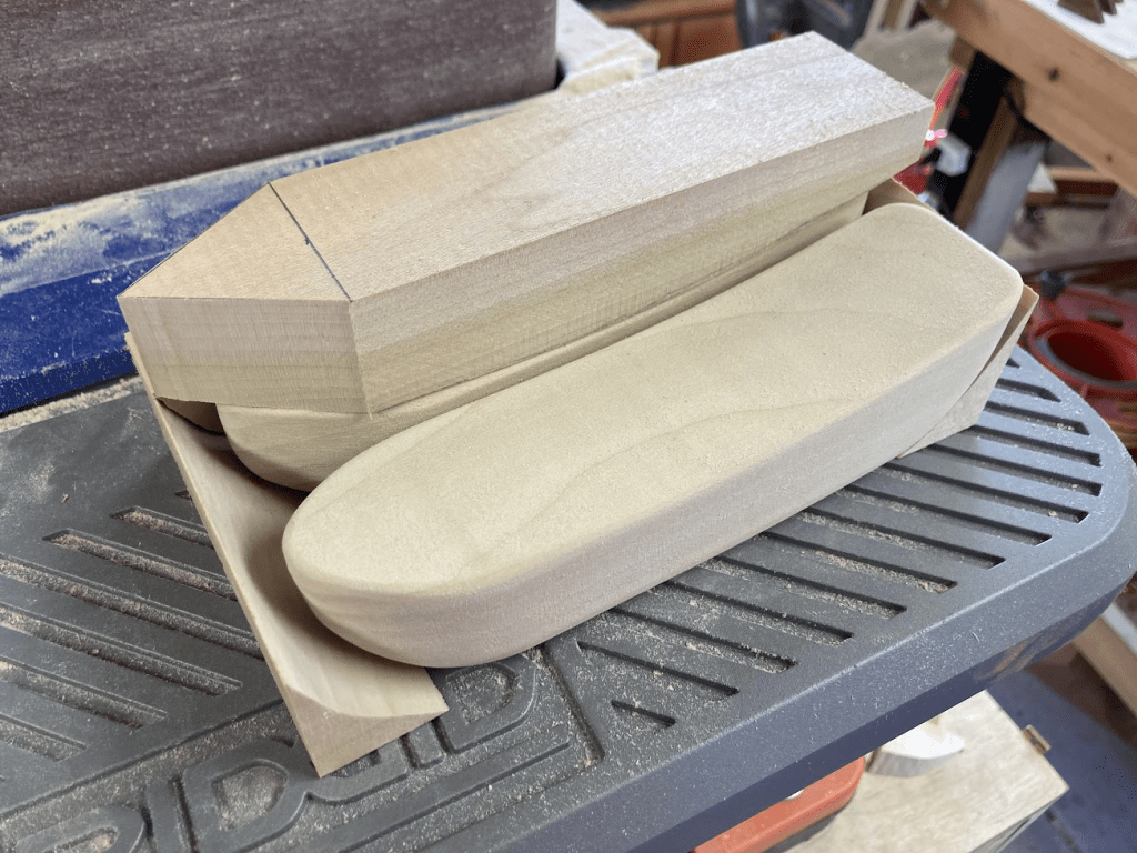 I had enough left over from the first wooden boat’s block of poplar to make the second one–so they get to be boat siblings. This second boat project was something of a woodworking redemption for me, with better tools and much improved skills. This time I used my 14″ bandsaw to cut out the hulls, and my oscillating belt sander to shape them.