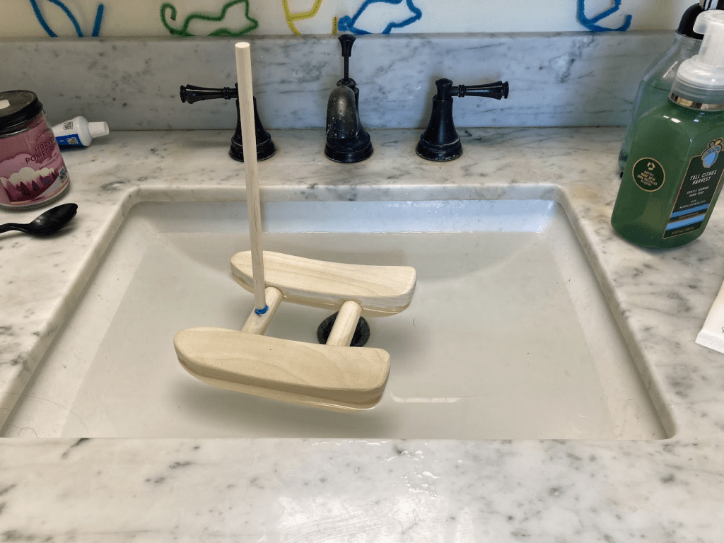 This time, the first float test was a resounding success–I made the sterns a little big to balance the weight of the mast.