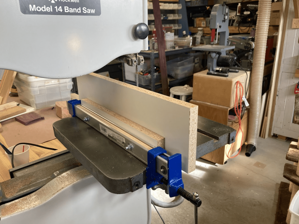 After struggling for some time with a jointed 4×6 and two clamps as a rip fence on my bandsaw, I found this video describing a DIY fence based on a Harbor Freight clamp. I just happened to have a couple of those clamps, so I made my own.