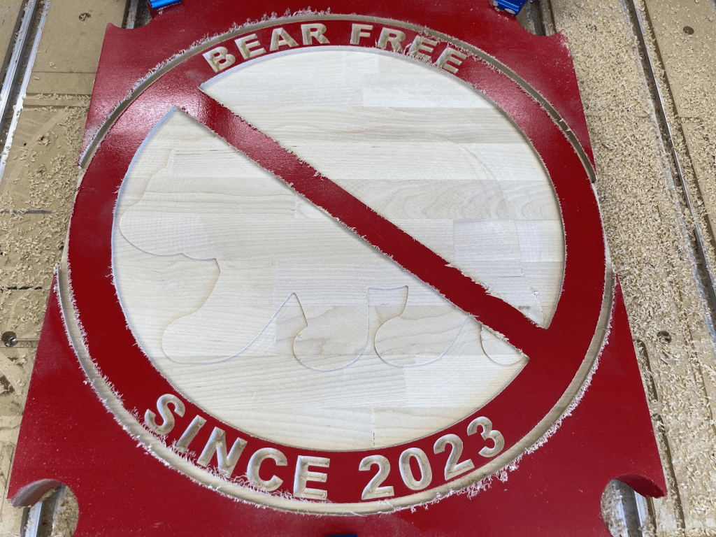After a bear attempted to break into my parents’ mountain cabin last year, my dad jokingly came up with an idea for a “no bears” sign I could make on my CNC router. For his birthday, I surprised him with his very own sign to let the bears know to move along.