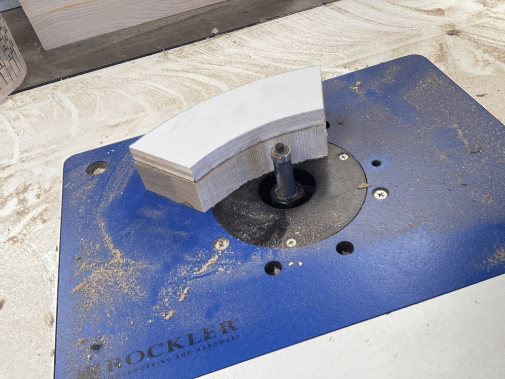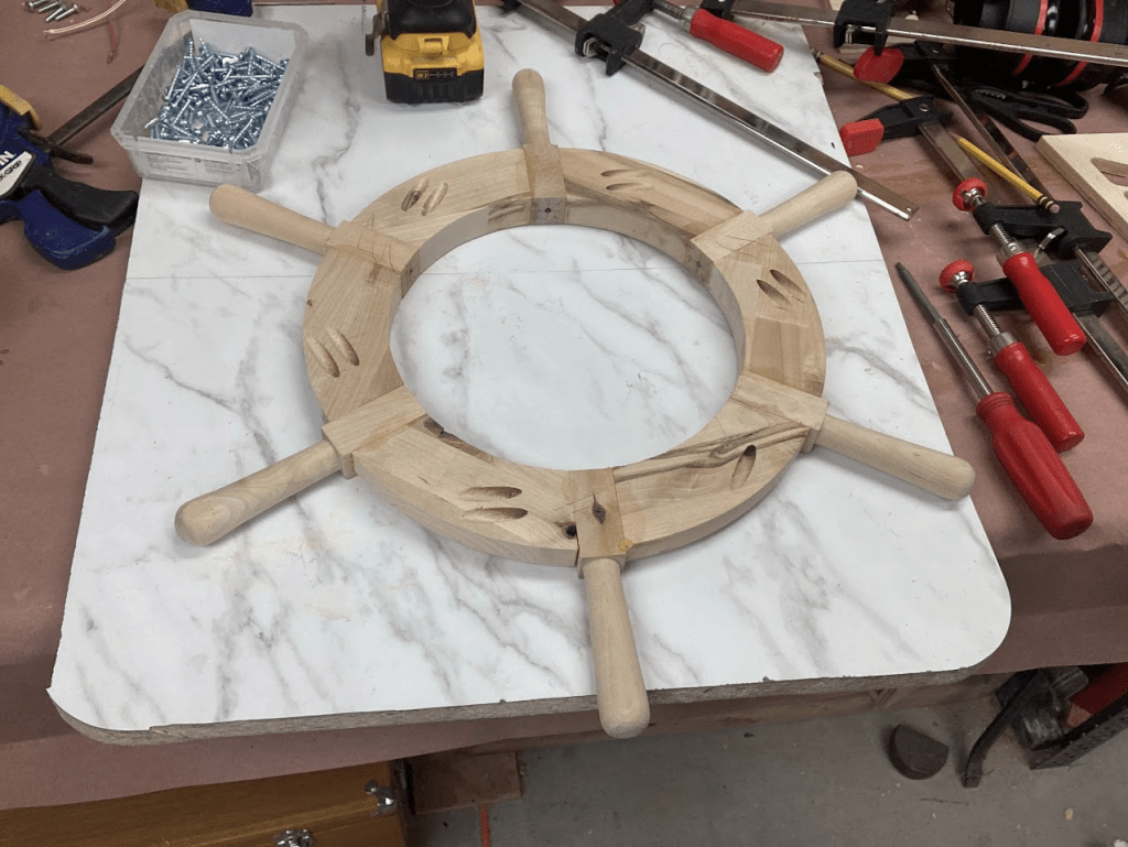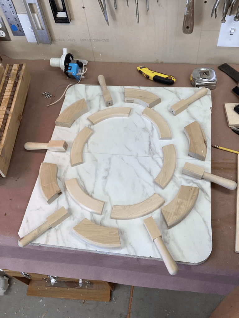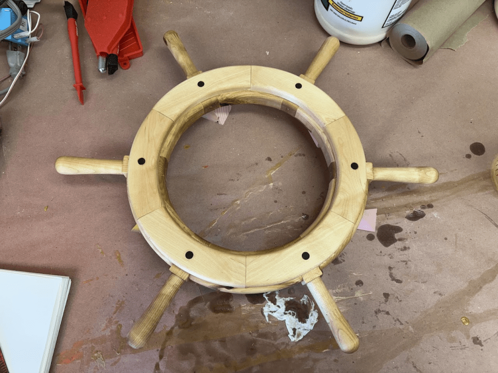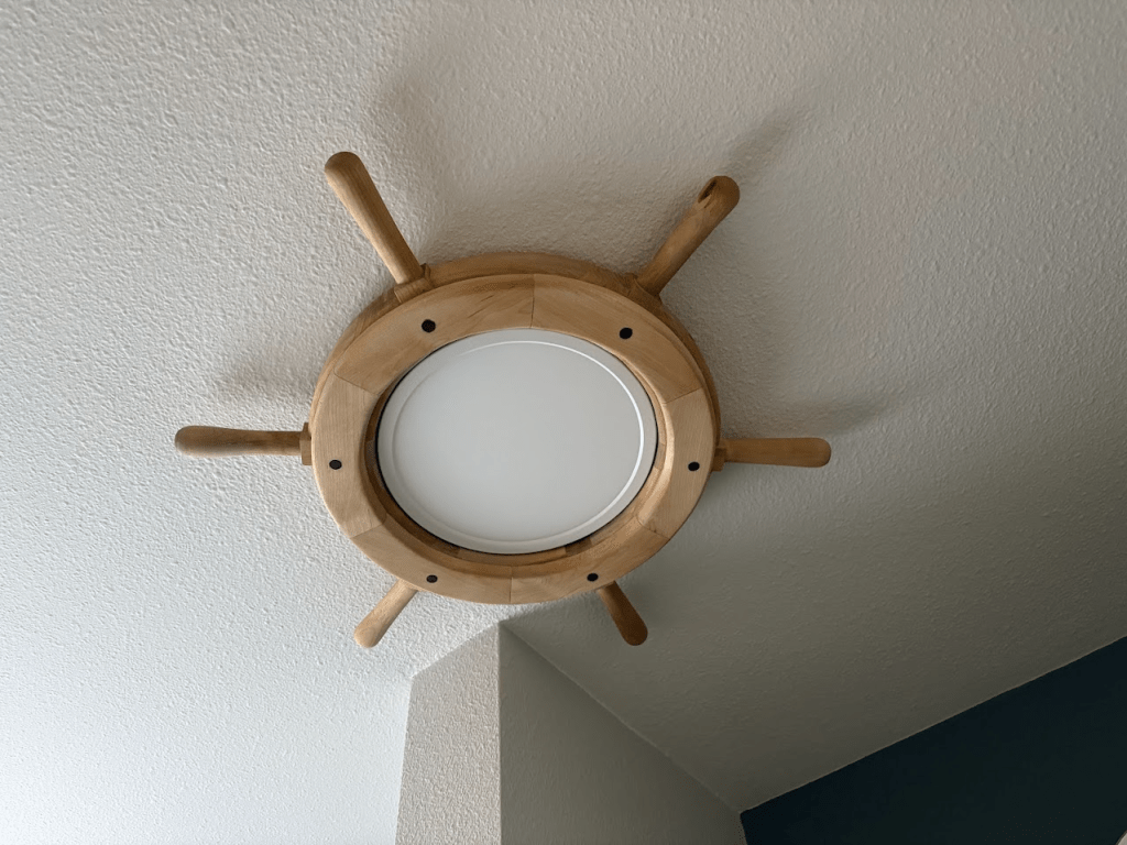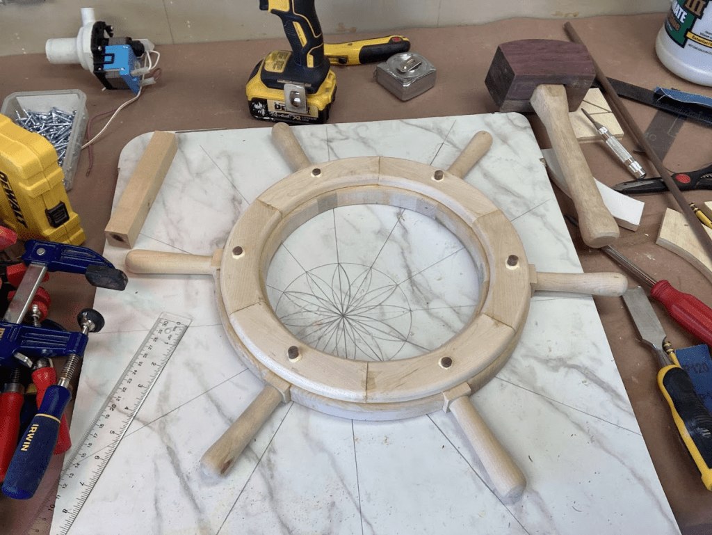 A couple of months ago we started a redecorating project in our half-bathroom, updating the paint scheme and a few of the fixtures to clean it up and add a fun new nautical theme. To cap it off, I made a ship’s wheel to surround the round LED panel mounted in the ceiling. I started off with a design in CAD to get the proportions right, then printed out shapes to glue to plywood to make router templates.